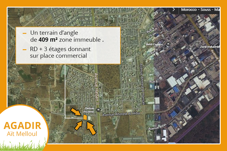 Terrain de 409 m² sur agadir zone immeuble RD + 3 etages donnant sur place commercial